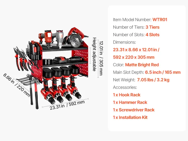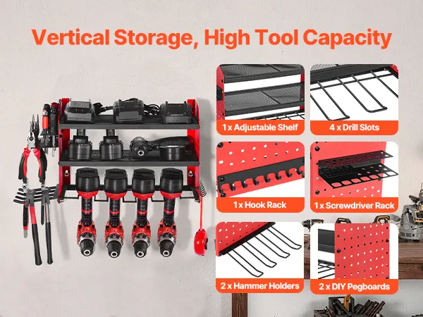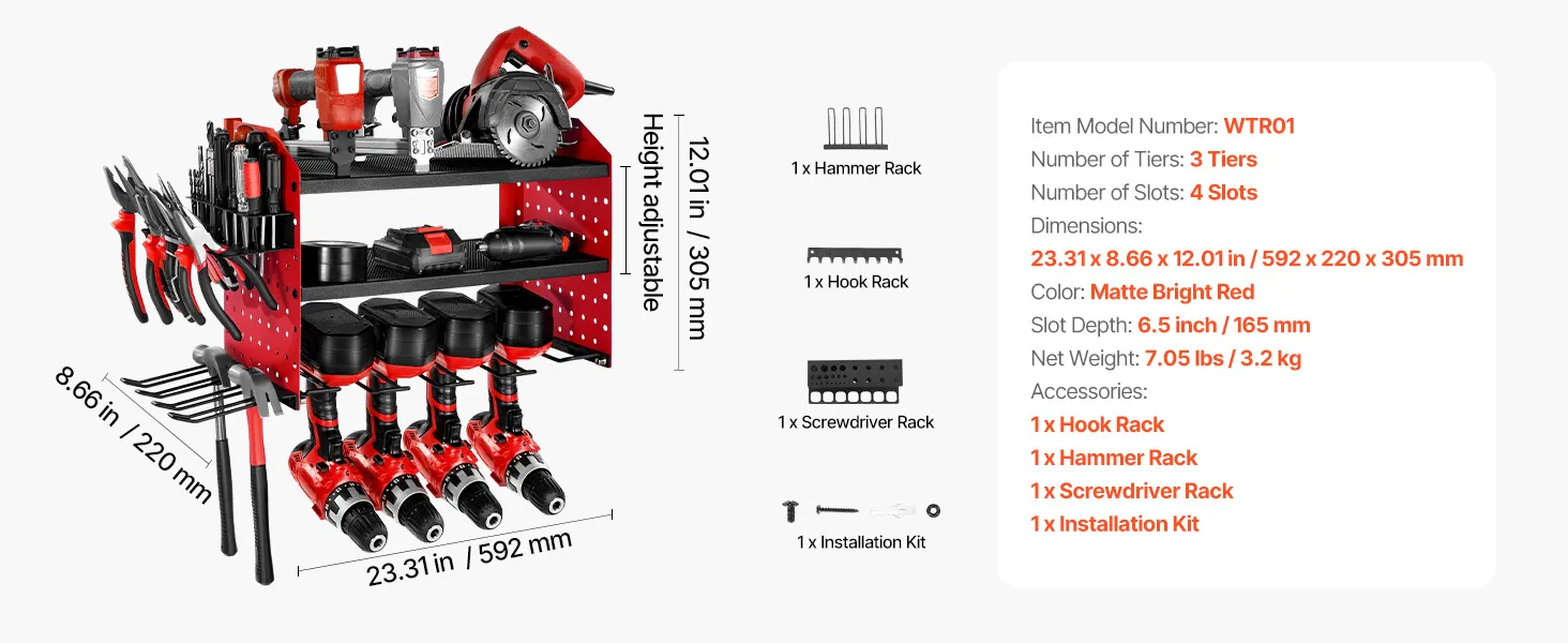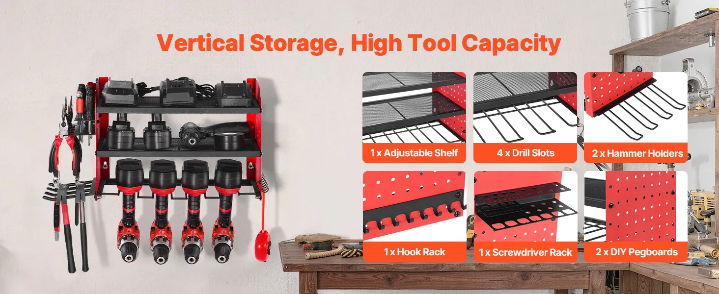 VEVOR Uchwyt ścienny do przechowywania narzędzi, 3-poziomowy regał magazynowy z 4 uchwytami na wiertła, uchwytem na narzędzia z bocznymi perforowanymi ściankami, organizer narzędziowy do garażu, stołu warsztatowego i warsztatu, czerwony