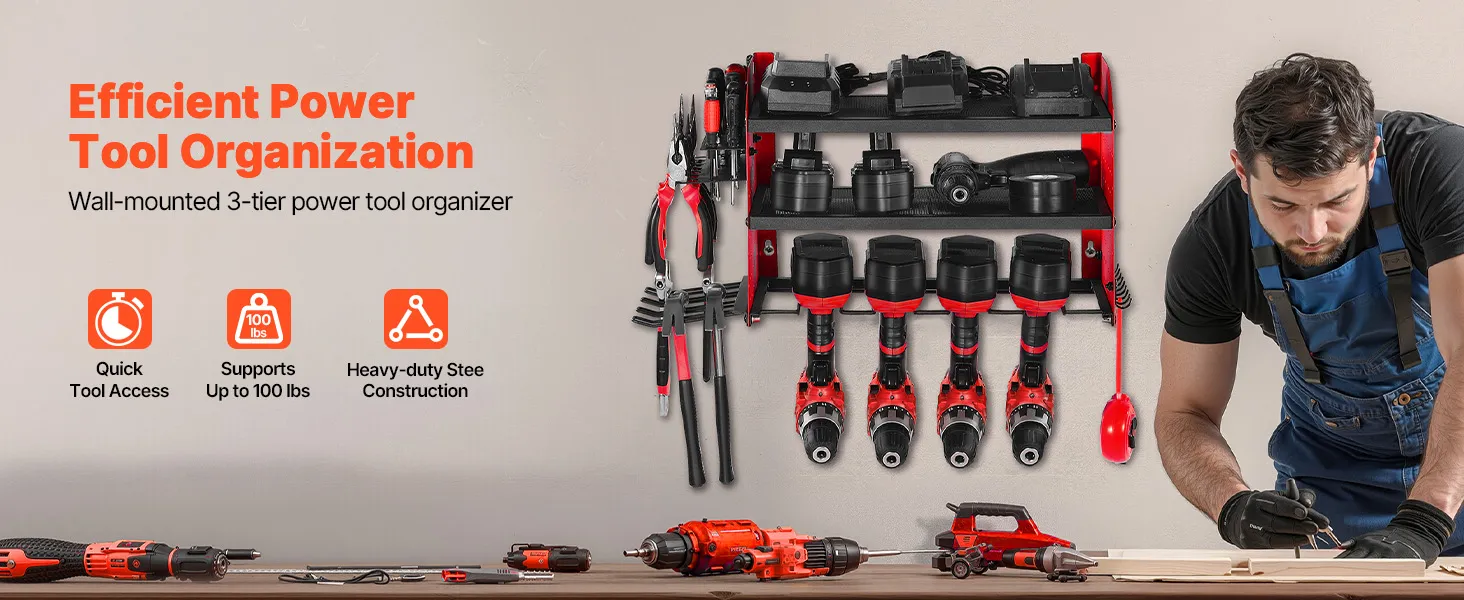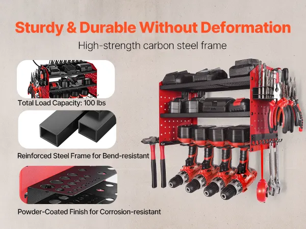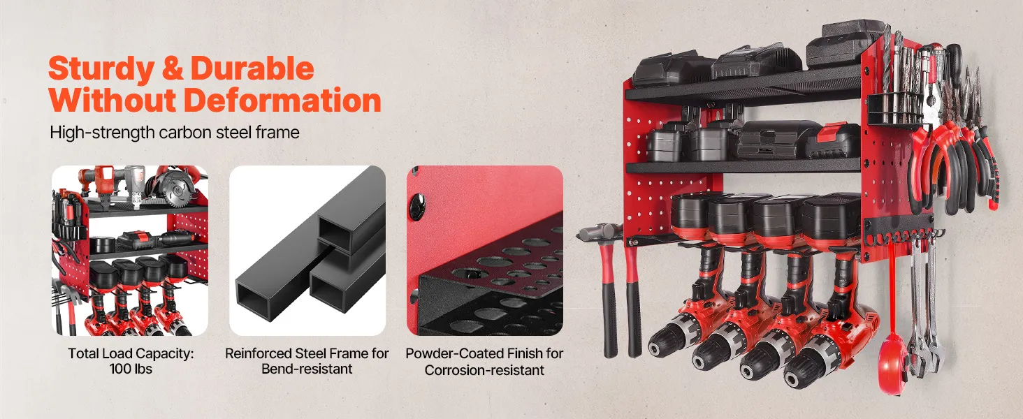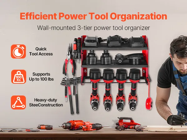 Ten montowany na ścianie, 3-poziomowy organizer na elektronarzędzia zapewnia szybki dostęp. Jego solidna rama ze stali węglowej wytrzymuje obciążenie do 45 kg i ułatwia przechowywanie wiertarek, skrzynek narzędziowych i innych akcesoriów, zapewniając uporządkowane i bezstresowe miejsce pracy.