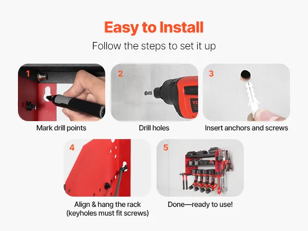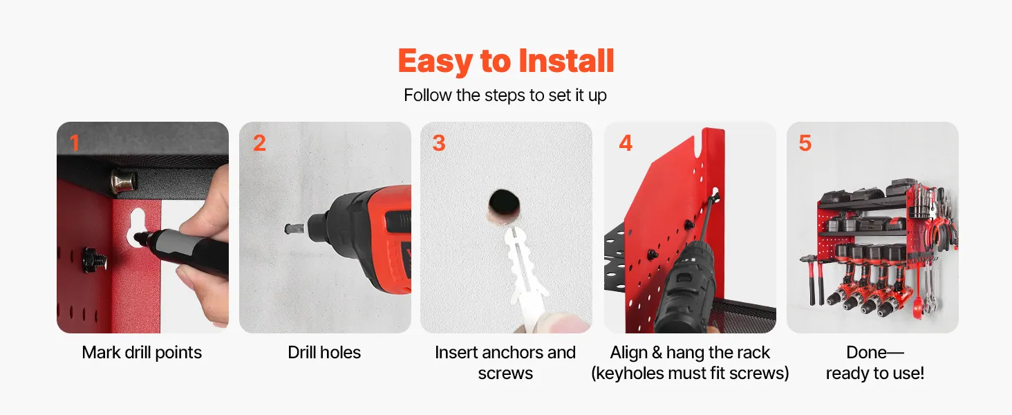 Nasz organizer wierteł zawiera przejrzyste instrukcje krok po kroku oraz wszystkie niezbędne elementy, w tym wkręty rozporowe, co umożliwia szybki i łatwy montaż na ścianie. Dzięki temu możesz go z łatwością zamontować w kilka minut.