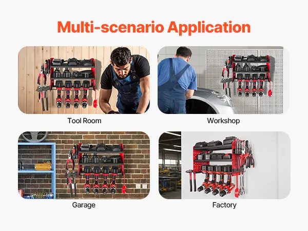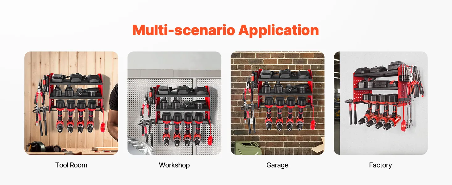 Idealny do stosowania na ścianach perforowanych w pomieszczeniach narzędziowych, betonowych ścianach garaży, blatach warsztatowych i murowanych ścianach fabryk, stojak na narzędzia zamienia zagracone przestrzenie w zorganizowane, wydajne obszary przechowywania, w których praca będzie sprawiać przyjemność.