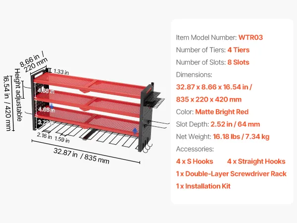 Wydajne przechowywanie: Ten 4-poziomowy stojak na narzędzia montowany na ścianie (835 x 220 x 420 mm) wyposażony jest w regulowaną półkę środkową, 8 otworów na wiertła, boki z perforowanej płyty, haki w kształcie litery S i proste haki, dzięki czemu narzędzia pozostają uporządkowane i łatwo dostępne