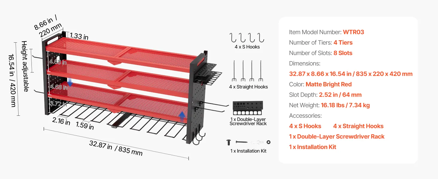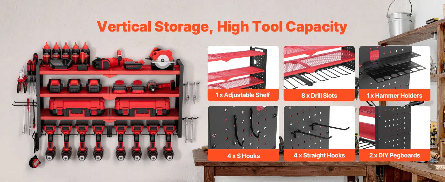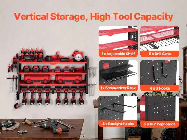 VEVOR Uchwyt ścienny do przechowywania narzędzi, 4-poziomowy regał magazynowy z 8 uchwytami na wiertła, uchwyt na narzędzia z bocznymi perforowanymi ściankami, organizer na narzędzia do garażu, stołu warsztatowego i warsztatu, czerwony