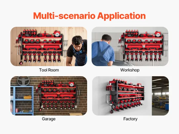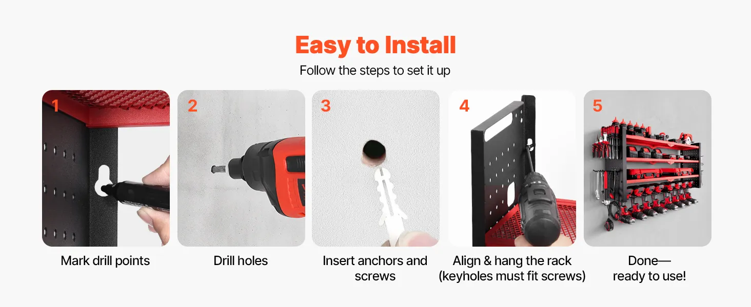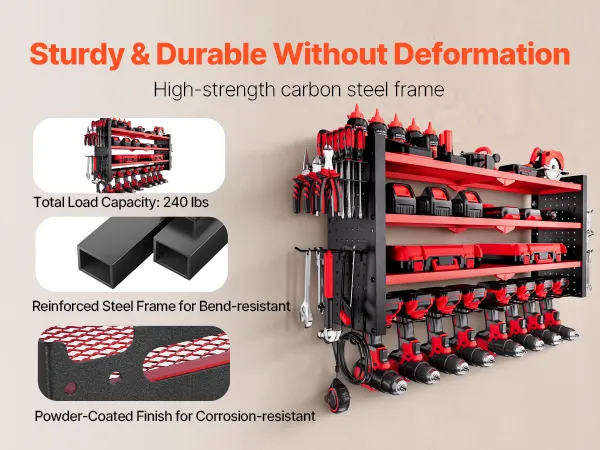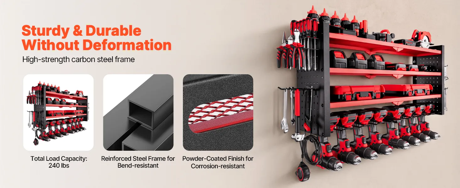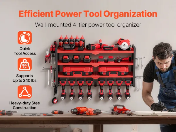 Ten montowany na ścianie, 4-poziomowy organizer na elektronarzędzia zapewnia szybki dostęp. Wytrzymała rama ze stali węglowej wytrzymuje obciążenie do 109 kg i ułatwia przechowywanie wiertarek, skrzynek narzędziowych i innych akcesoriów, zapewniając uporządkowane i bezstresowe miejsce pracy.