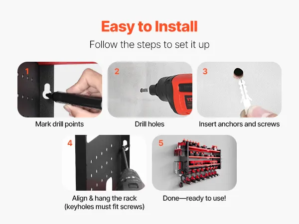 Nasz organizer wierteł zawiera przejrzyste instrukcje krok po kroku oraz wszystkie niezbędne elementy, w tym wkręty rozporowe, co umożliwia szybki i łatwy montaż na ścianie. Dzięki temu możesz go z łatwością zamontować w kilka minut.