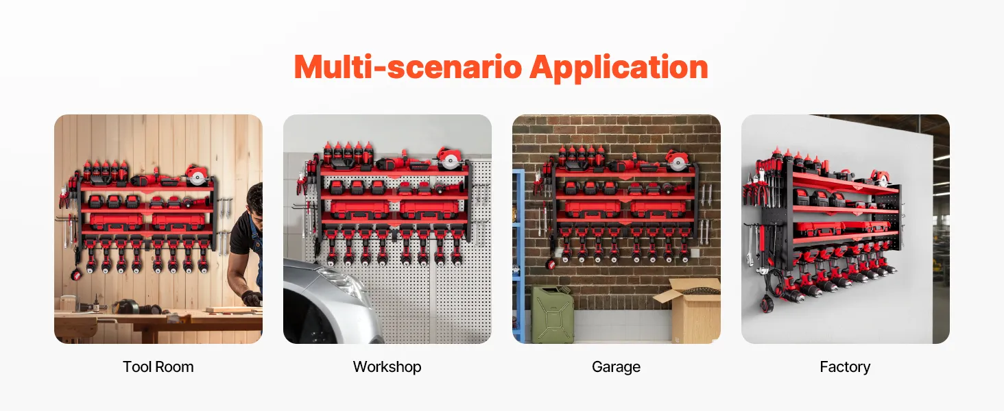 Idealny do stosowania na ścianach perforowanych w pomieszczeniach narzędziowych, betonowych ścianach garaży, blatach warsztatowych i murowanych ścianach fabryk, stojak na narzędzia zamienia zagracone przestrzenie w zorganizowane, wydajne obszary przechowywania, w których praca będzie sprawiać przyjemność.