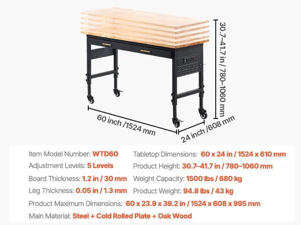 VEVOR 60" Regulowany stół warsztatowy, udźwig 1500 funtów, stół warsztatowy z szufladami, gniazdem elektrycznym, kółkami i ścianką perforowaną, wytrzymały stół roboczy z blatem dębowym do garażu, warsztatu, biura i domu