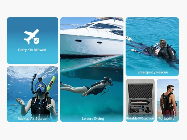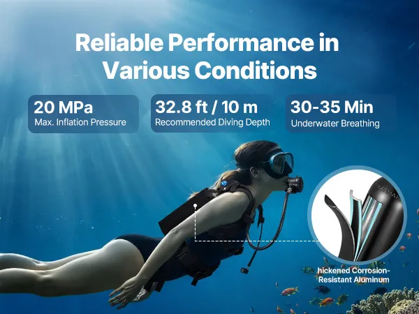 Długotrwałe nurkowania: Nasza minibutla nurkowa o dużej pojemności 0,52 galona (2 l) pozwala na oddychanie pod wodą przez 30 do 35 minut na głębokości do 10 m (32,8 stopy). Nadaje się do dłuższych nurkowań podwodnych, lżejszych prac lub w sytuacjach awaryjnych.