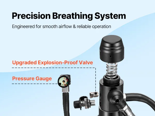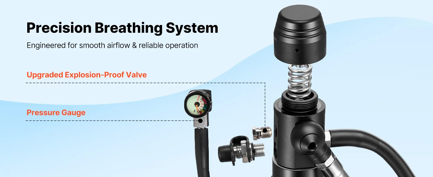 Łatwiejsze oddychanie: Wyposażona w precyzyjnie zintegrowany regulator ciśnienia i ulepszony rdzeń zaworu oddechowego, ta butla wypełniona płucami zapewnia stabilny i stały przepływ powietrza. Zewnętrzny dysk przeciwwybuchowy zapewnia dodatkową ochronę przed nadciśnieniem.
