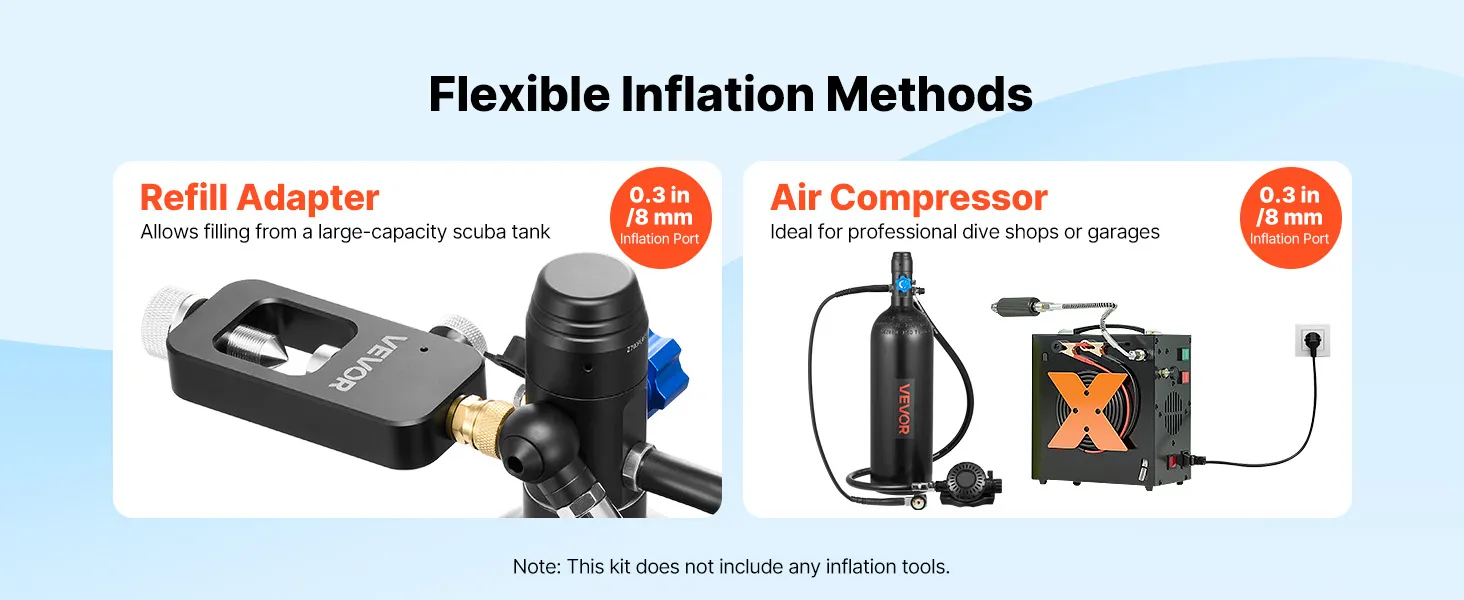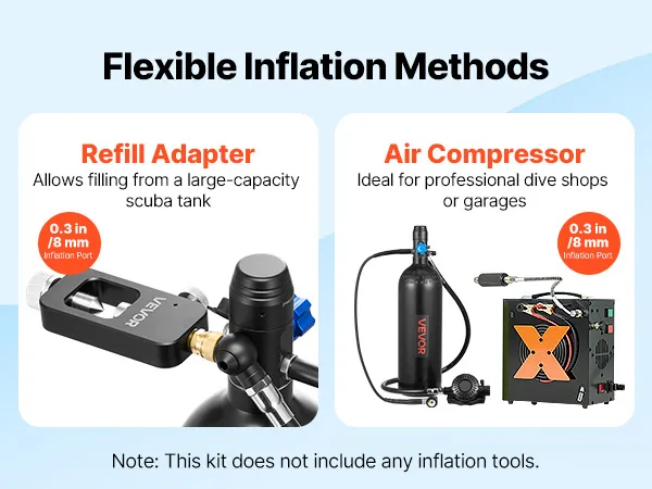 Dwie metody napełniania: naszą butlę do nurkowania można podłączyć do większej butli do nurkowania za pomocą specjalnego adaptera lub napełnić ją przy użyciu kompatybilnej sprężarki powietrza (urządzenie do napełniania nie jest dołączone).