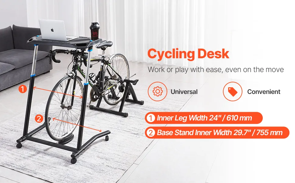 Szeroka kompatybilność: Stolik rowerowy wzbogaci Twoje wrażenia z jazdy na rowerze. Dzięki wewnętrznej szerokości nogi wynoszącej 610 mm (24") i szerokości podstawy rozszerzalnej do 755 mm (29,7"), jest kompatybilny z większością rowerów i bieżni, zapewniając wygodę. Ten wszechstronny stolik rowerowy zapewni Ci wspaniałe wrażenia!