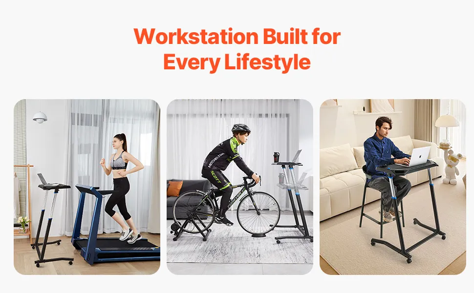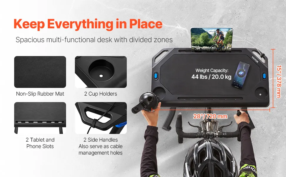 Ten stolik rowerowy pasuje do większości rowerów stacjonarnych i bieżni, oferując miejsce do przechowywania sprzętu i kubków. Jego wysokość jest regulowana, a stalowo-aluminiowa rama zapewnia stabilność. Jest wszechstronny i może służyć również jako biurko do pracy na stojąco, stanowisko do tatuażu lub stół do transmisji na żywo.