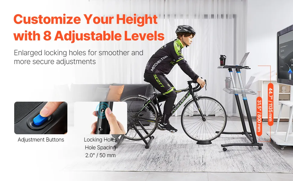 VEVOR Stolik rowerowy stacjonarny, składany, regulowany, do trenażera rowerowego i bieżni, z blokowanymi kółkami, antypoślizgowy stół fitness z wieloma otworami na trenażer rowerowy i kierownicę