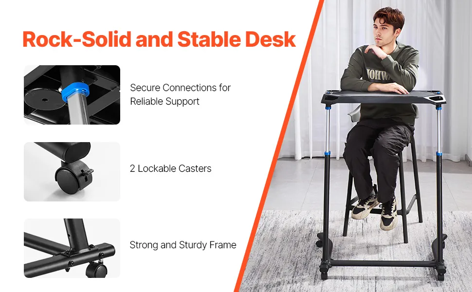 Stabilna i trwała rama: Solidna rama gwarantuje niezawodność nawet pod dużym obciążeniem. Konstrukcja ze stali i stopu aluminium, z dwoma prętami podporowymi łączącymi podstawę z nogami oraz dwoma dodatkowymi prętami mocującymi blat, gwarantuje stabilność i trwałość oraz zapobiega przechylaniu się biurka do przodu po zablokowaniu.