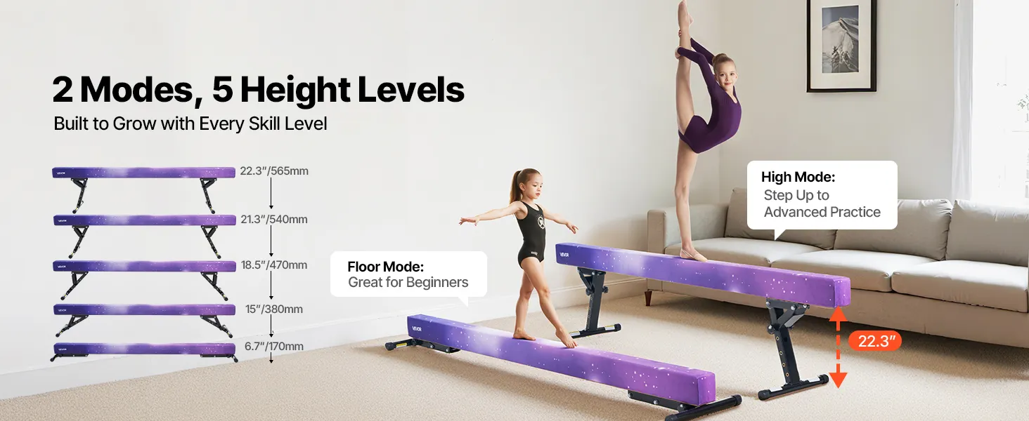 5 poziomów wysokości i 2 tryby: Ta regulowana równoważnia o długości 94,9 cala (241 cm) oferuje dwa tryby treningowe: tryb podłogowy dla początkujących i tryb podwyższony dla zaawansowanych. Wysokość można regulować w zakresie od 6,7 cala do 15 / 18,5 / 21,3 / 22,3 cala (170 / 380 / 470 / 540 / 565 mm).