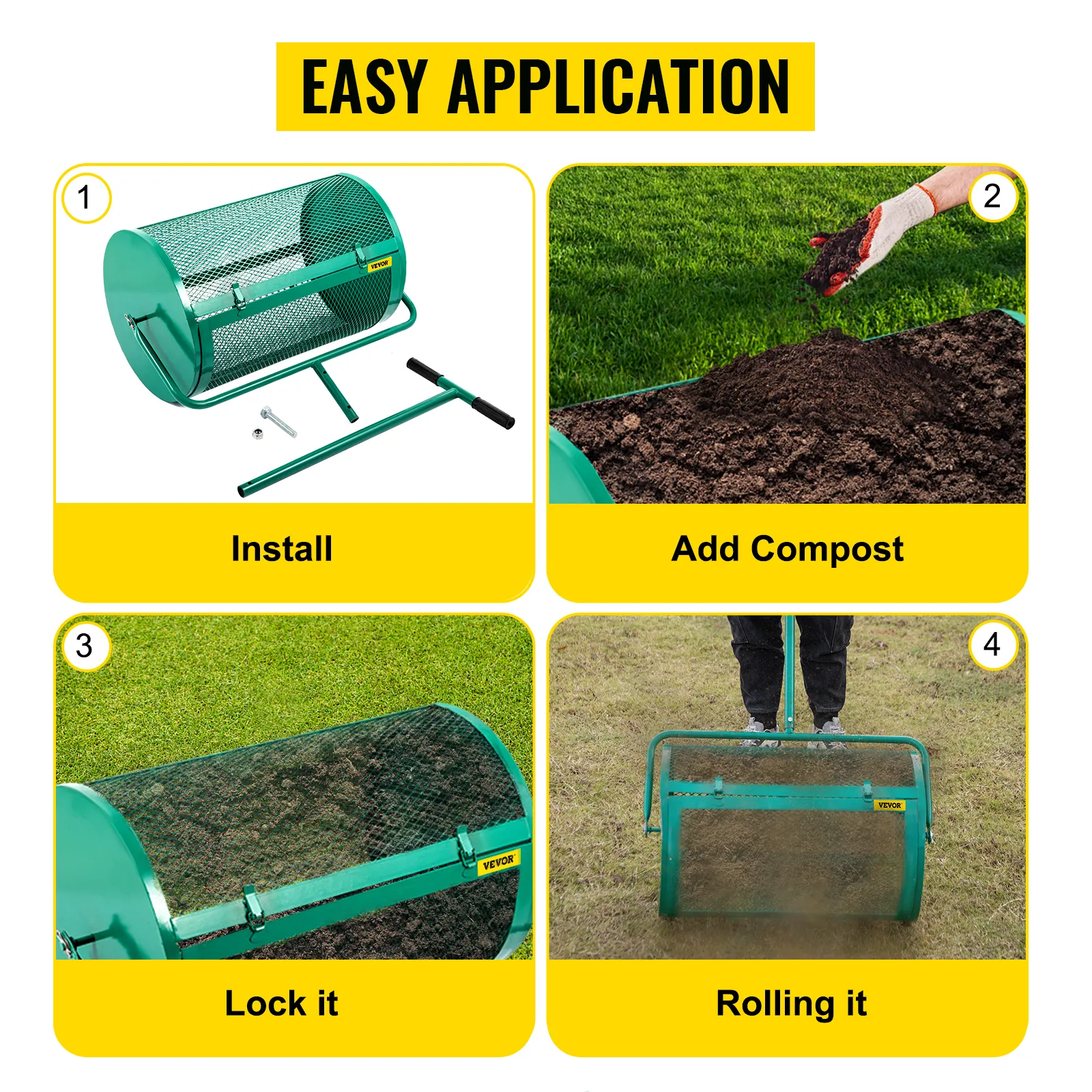 Będziesz wiedział, jak korzystać z tego rozrzutnika kompostu, gdy tylko go zobaczysz. Jest całkiem łatwy w użyciu: najpierw zainstaluj; po drugie wlać kompost; po trzecie, zablokuj zatrzaski; ostatni, gotowy do toczenia.