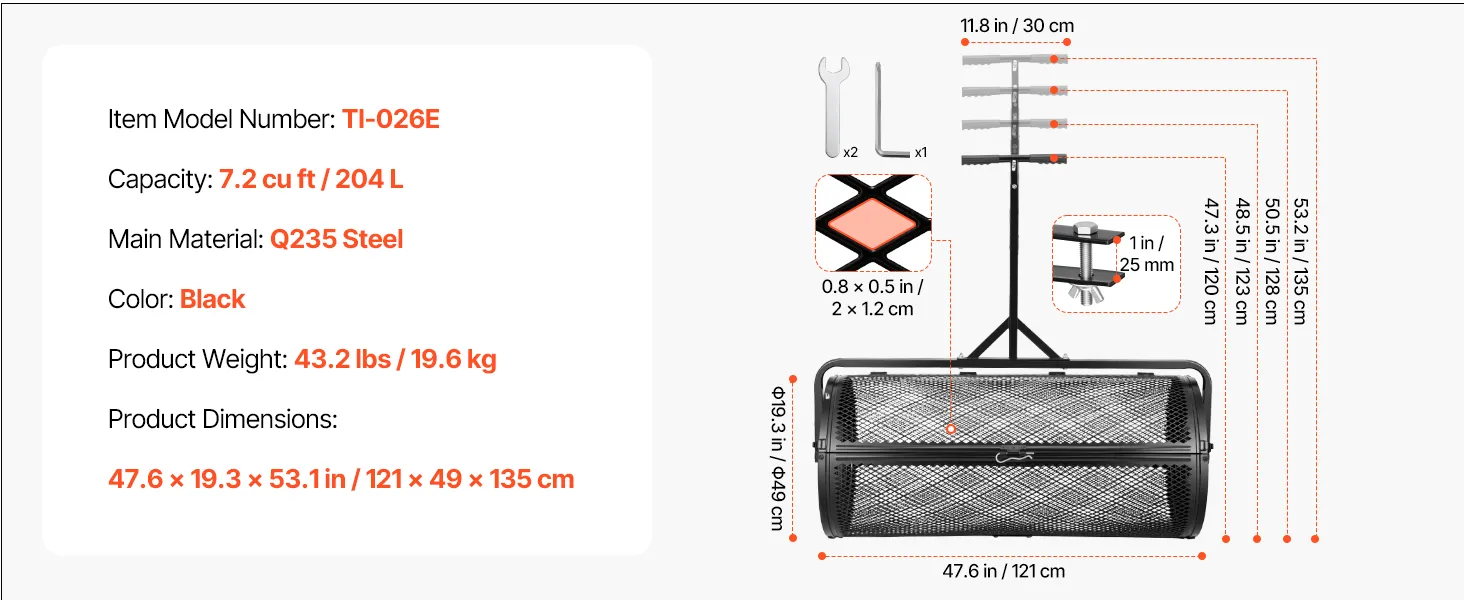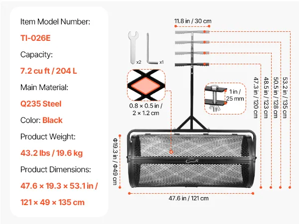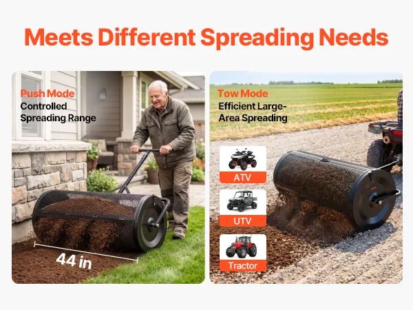 • Wszechstronna konstrukcja: Nasz rozsiewacz kompostu może być używany jako urządzenie ręczne lub zamontowany na traktorze, quadzie lub UTV za pomocą zaczepu 25 mm (1 cal). Posiada bęben o wymiarach 121 x Ø 49 cm (47,6 cala x Ø 19,3 cala) i pojemności 204 l (7,2 stopy sześciennej) oraz szerokości rozrzutu około 112 cm (44 cale) do nawożenia ogrodów i gruntów rolnych.