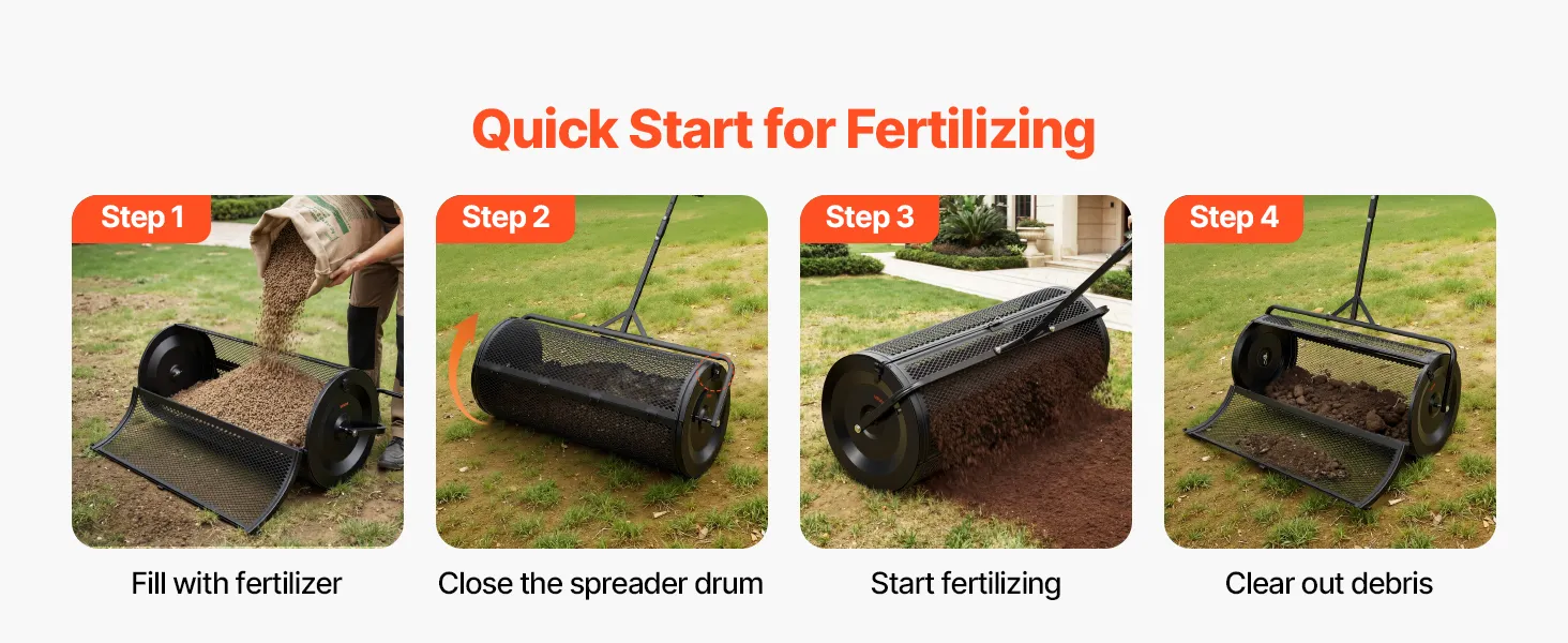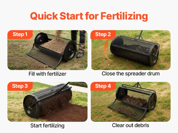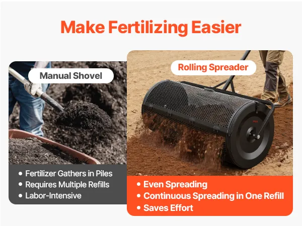 • Łatwy w użyciu: Rozsiewacz torfu do trawników posiada otwór o szerokości 34,5 cm (13,6 cala), co ułatwia napełnianie z worków na nawóz lub wózków, redukując ilość odpadów. Po napełnieniu wystarczy zamknąć boczne zamknięcia i rozpocząć rozsiewanie. Do zestawu dołączono czytelną instrukcję szybkiego montażu.