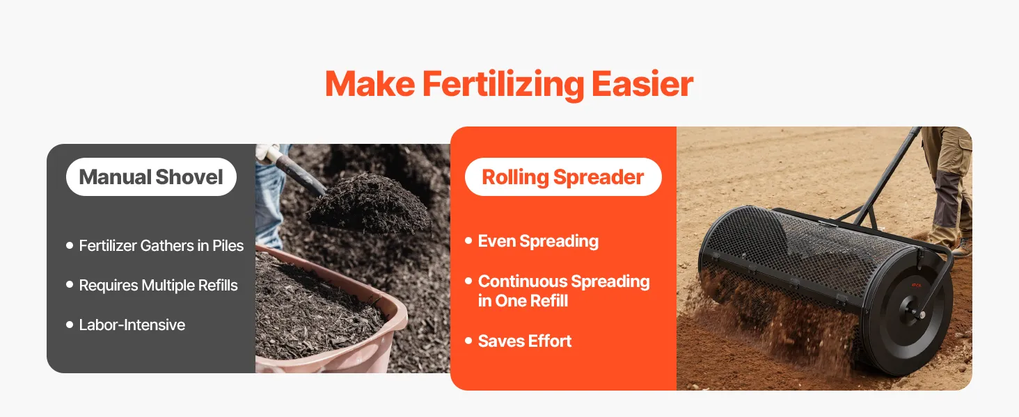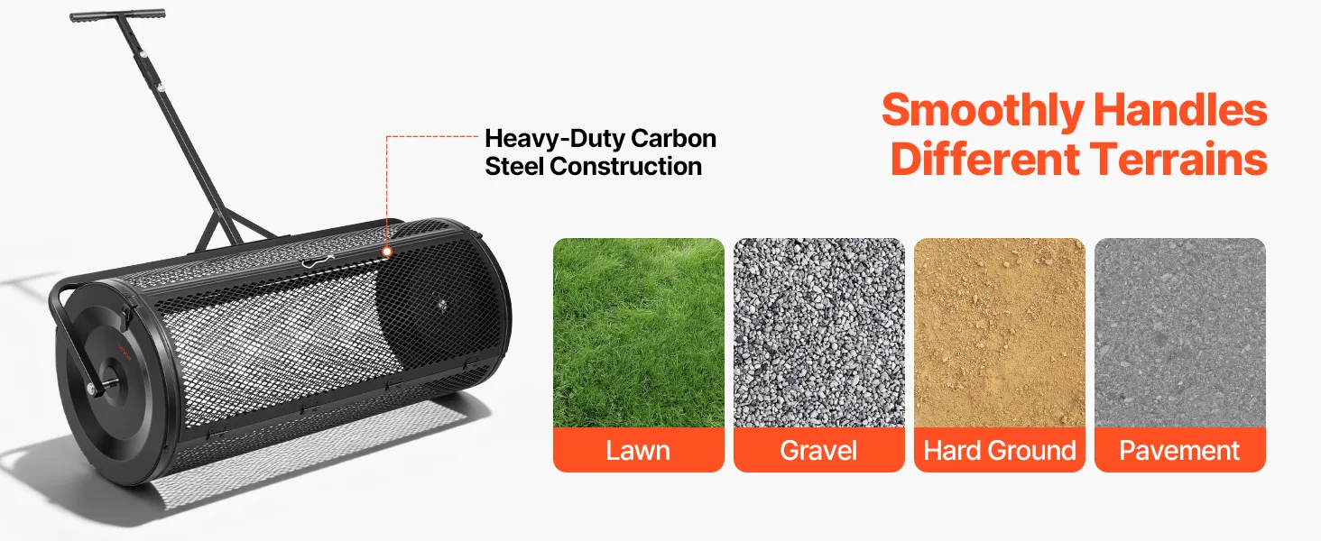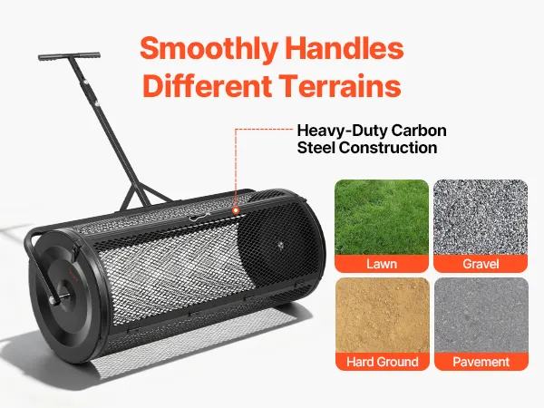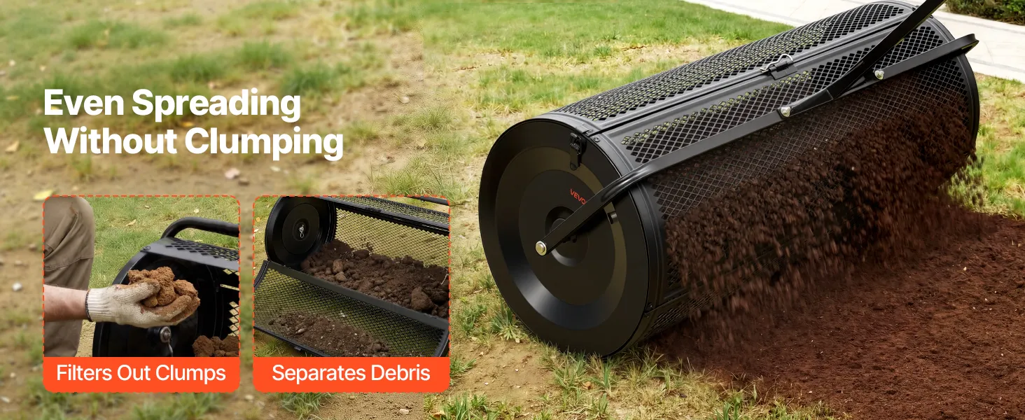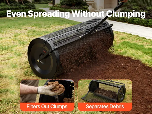 • Równomierne rozprowadzanie: Ten rozsiewacz torfu wykorzystuje drobne sito w kształcie diamentu (2 x 1,2 cm / 0,8 x 0,5 cala) do filtrowania zanieczyszczeń i grudek, zapewniając równomierne rozprowadzanie. Nadaje się do torfu, gleby wierzchniej, kompostu, piasku i obornika, a także sprzyja lepszemu wzrostowi trawnika.