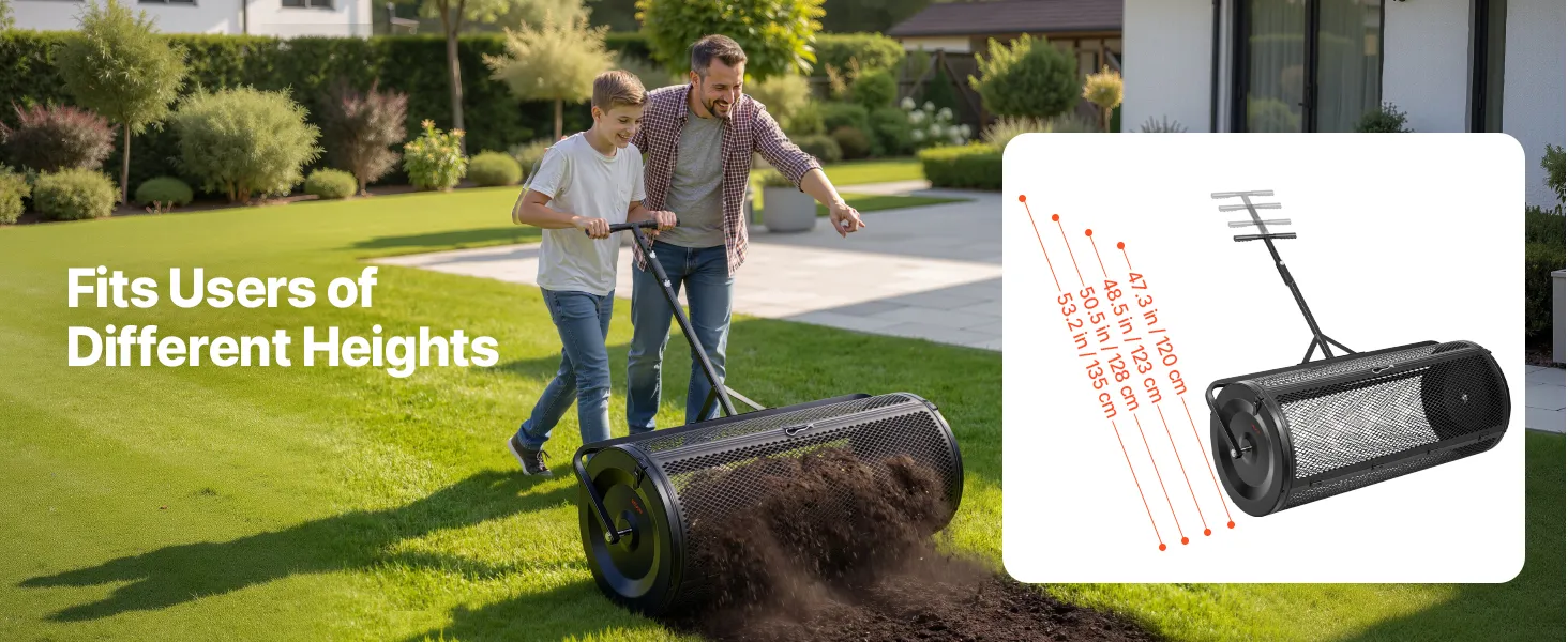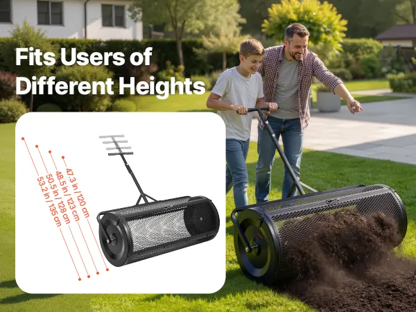 • Cztery ustawienia regulacji wysokości: Ten rozrzutnik obornika oferuje cztery ustawienia wysokości: 120 cm (47,3 cala), 123 cm (48,5 cala), 128 cm (50,5 cala) i 135 cm (53,2 cala). Regulowane otwory montażowe w uchwycie sprawiają, że jest on odpowiedni dla użytkowników o różnym wzroście, a ergonomiczny uchwyt zmniejsza zmęczenie.