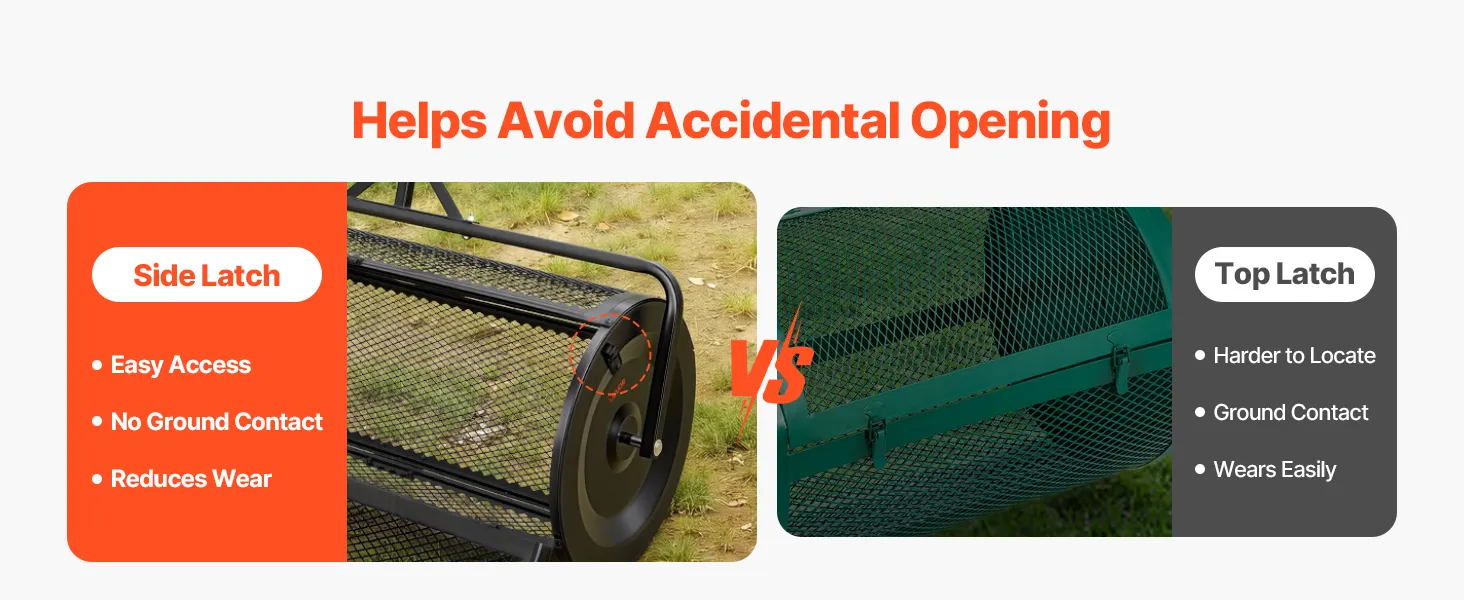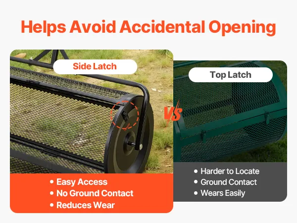 • Zaprojektowany z myślą o długowieczności: Ten walec kompostowy ze stali węglowej jest malowany proszkowo dla optymalnej ochrony przed korozją. Ulepszona trójkątna podstawa zapewnia stabilność na żwirze, trawie i twardych nawierzchniach, a boczne metalowe zatrzaski zapobiegają przypadkowemu otwarciu.