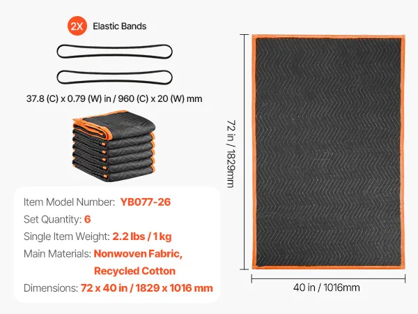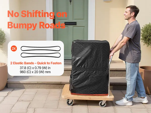 Zestaw 6 elementów: Zawiera 6 koców pakunkowych, które zaspokoją potrzeby rodzin i biur podczas przeprowadzek i przechowywania wielu przedmiotów. W zestawie 2 gumki do szybkiego mocowania koców do mebli, zapobiegając ich poluzowaniu lub przesuwaniu, co usprawnia przeprowadzkę.