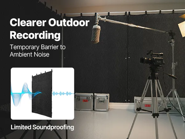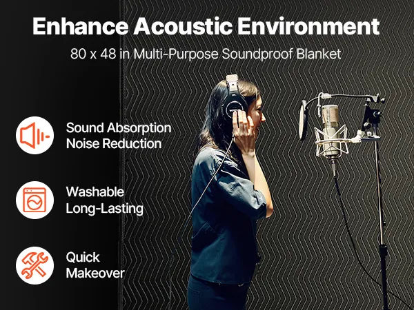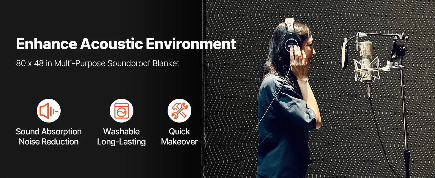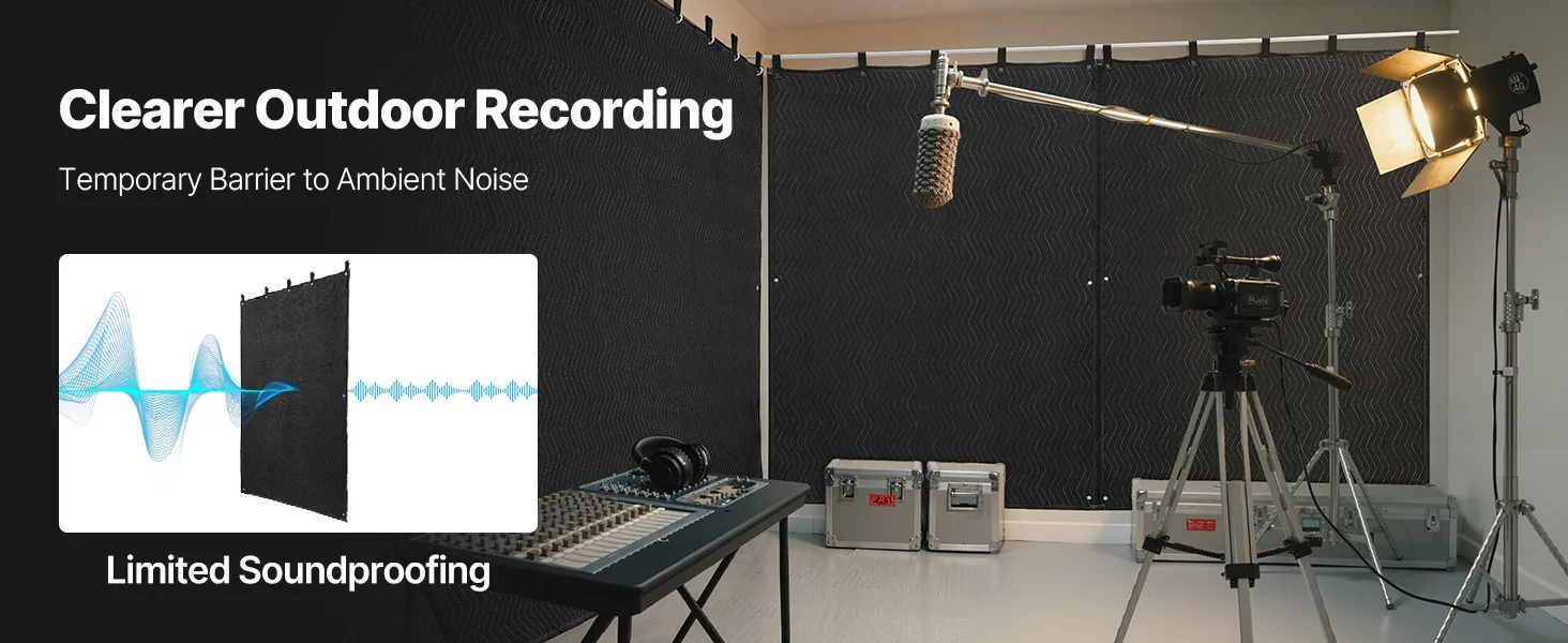 Ten dźwiękoszczelny koc można powiesić na ścianie lub suficie, aby zredukować odbicia dźwięku i sprawić, że nagrania w studiach muzycznych i domowych pomieszczeniach do streamingu będą wyraźniejsze dzięki zminimalizowaniu pogłosu.