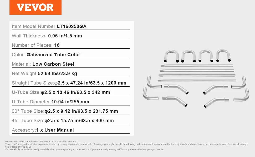 Zestaw wydechowy VEVOR, 16 elementów, uniwersalny, wykonany ze stali ocynkowanej, 63,5 mm, ze złączem wtykowym i dużą rurą wydechową, rura wydechowa ze stali nierdzewnej do układu wydechowego, do warsztatu samochodowego i sklepu 4S