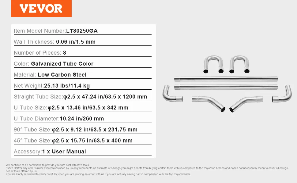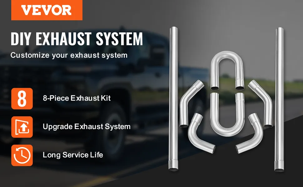 Zestaw wydechowy VEVOR 8-częściowy, uniwersalny, wykonany ze stali nierdzewnej ocynkowanej 63,5 mm, ze złączem wtykowym i dużą rurą wydechową, rura wydechowa odporna na rdzę do układu wydechowego, do warsztatu samochodowego i sklepu 4S