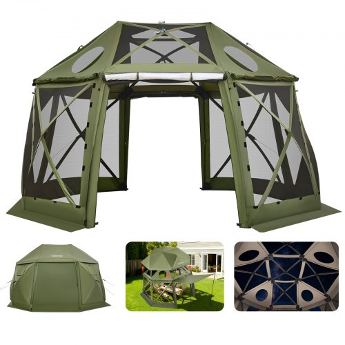 Namiot rozkładany VEVOR z 6-stronnym daszkiem, osłoną przeciwsłoneczną z 6 zdejmowanymi osłonami przeciwwiatrowymi i oknami z siatki, 12 x 12 stóp, namiot szybko rozkładany z moskitierą, kolor zielony wojskowy