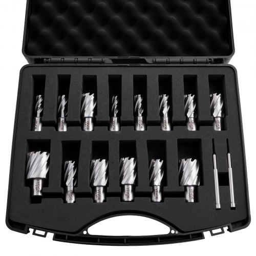 Zestaw wierteł rdzeniowych HSS VEVOR, chwyt Weldon, 13 elementów, zestaw wierteł magnetycznych, średnica cięcia 11,11–26,98 mm, 11 wierteł z 2 kołkami centrującymi, głębokość cięcia 50,8 mm, plastikowa obudowa, do wiertarek magnetycznych, stal