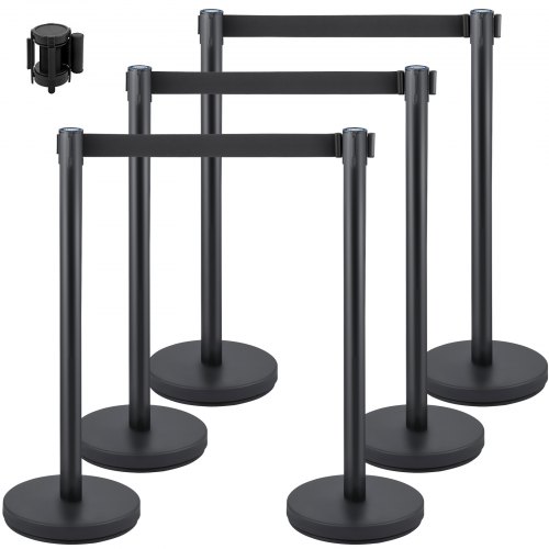 Słupki odgradzające VEVOR (opakowanie 6 szt.) z 6 chowanymi pasami, słupki odgradzające ze stali węglowej z pustą podstawą na wesela i wystawy, czarne