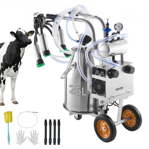 Elektryczna dojarka do krów VEVOR, wiadro ze stali nierdzewnej 304 o pojemności 6,6 galona/25 l, automatyczna dojarka próżniowa z pulsacją, przenośna dojarka z silikonowym kubkiem i przewodami do kontaktu z żywnością, regulowane ciśnienie