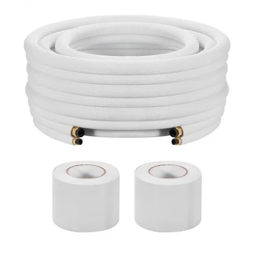 Zestaw kanałów VEVOR 15240 mm Mini Split Ducting Kit o średnicy zewnętrznej 9,53 mm i 15,875 mm, z miedzianymi rurkami i trójwarstwową izolacją do mini split klimatyzatorów, jednostek chłodniczych lub pomp ciepła i systemów HVAC z taśmą opaskową.
