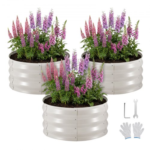 VEVOR Metalowa podniesiona grządka ogrodowa, zestaw 3 szt., φ60 x 30 cm, okrągła grządka ogrodowa, zestaw doniczek ogrodowych, grządka warzywna z rękawiczkami, grządka bez dna, grządka do kwiatów, ziół i warzyw, beżowa