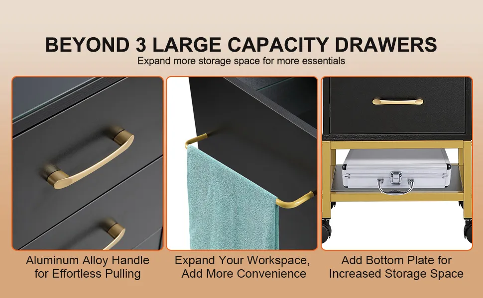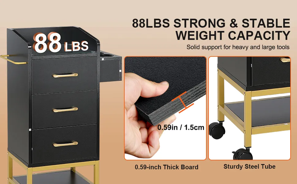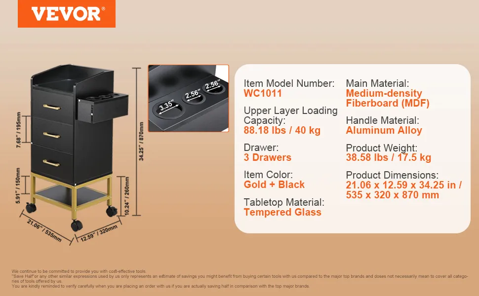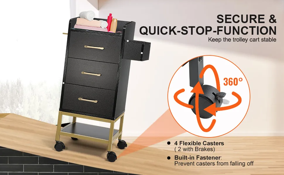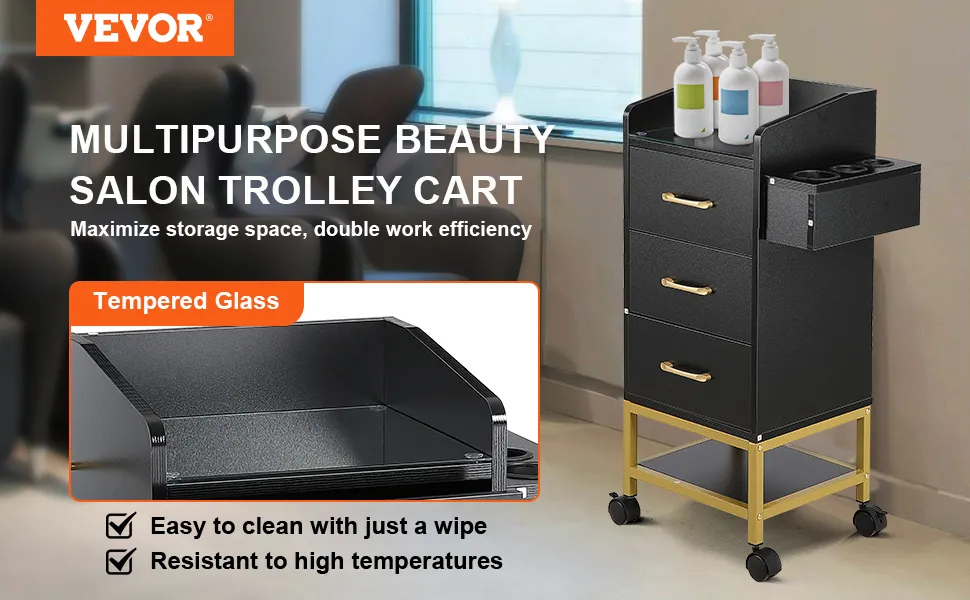 Wózek do przechowywania kosmetyków VEVOR jest nie tylko funkcjonalny, ale i stylowy. Ma blat ze szkła hartowanego, który dodaje wózkowi elegancji. Dzięki temu jest doskonałym dodatkiem do każdego salonu lub domu. Złota i czarna kolorystyka nadaje mu nowoczesny wygląd i dobrze pasuje do różnych stylów wystroju. Elegancki design tworzy wyrazisty element, dodając wyjątkowego stylu do Twojej przestrzeni roboczej. Chociaż ten wózek wygląda bardzo stylowo, nadal oferuje dużo miejsca do przechowywania i łatwą mobilność.