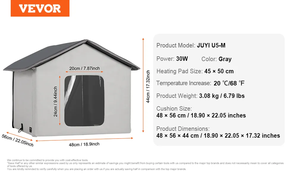 Ten ogrzewany domek dla kota wyposażony jest w matę grzewczą o mocy 30 W z regulacją temperatury w zakresie od 40 do 60°C (104–140°F). Inteligentny termostat zapewnia ciągłe ogrzewanie i posiada zabezpieczenie przed przegrzaniem i przetężeniem, zapewniając bezpieczne warunki do spania.