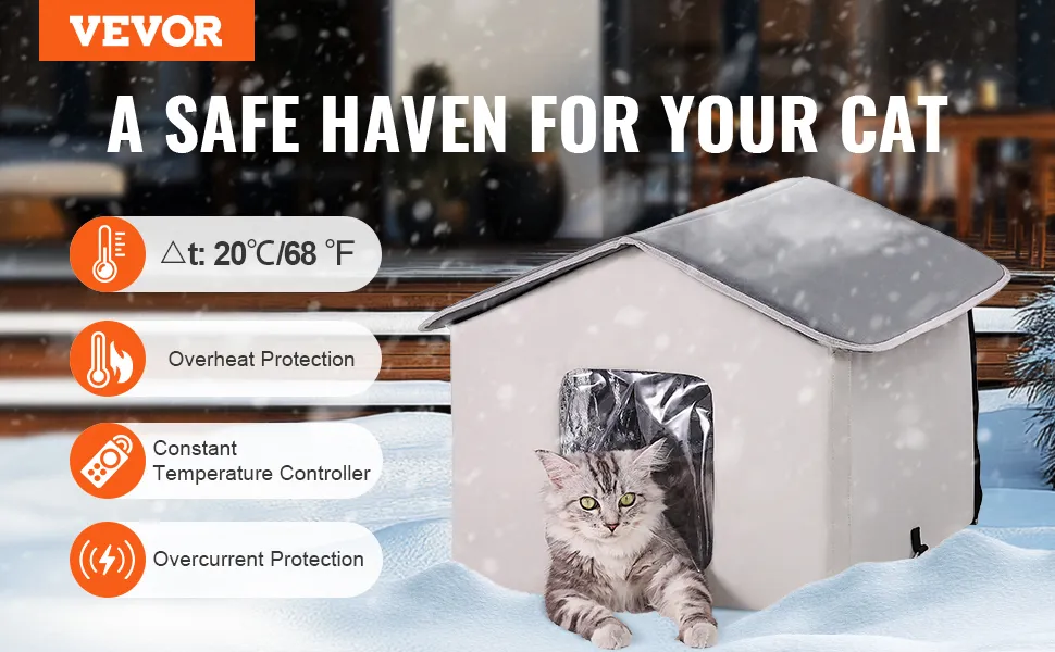Bezpieczna mata grzewcza: Wyposażony w wodoodporną matę grzewczą o mocy 30 W, ten ogrzewany domek dla kota oferuje zakres temperatur grzania od 40°C do 60°C (104–140°F), zapewniając kotu ciepło w chłodne dni. Jest szczególnie odpowiedni do użytku zimą lub w chłodniejszym klimacie. Dzięki wbudowanemu zabezpieczeniu przed awarią zasilania i inteligentnemu termostatowi może działać nieprzerwanie, a jednocześnie oferuje zabezpieczenie przed przegrzaniem i przetężeniem, co zapewnia bezpieczne użytkowanie.