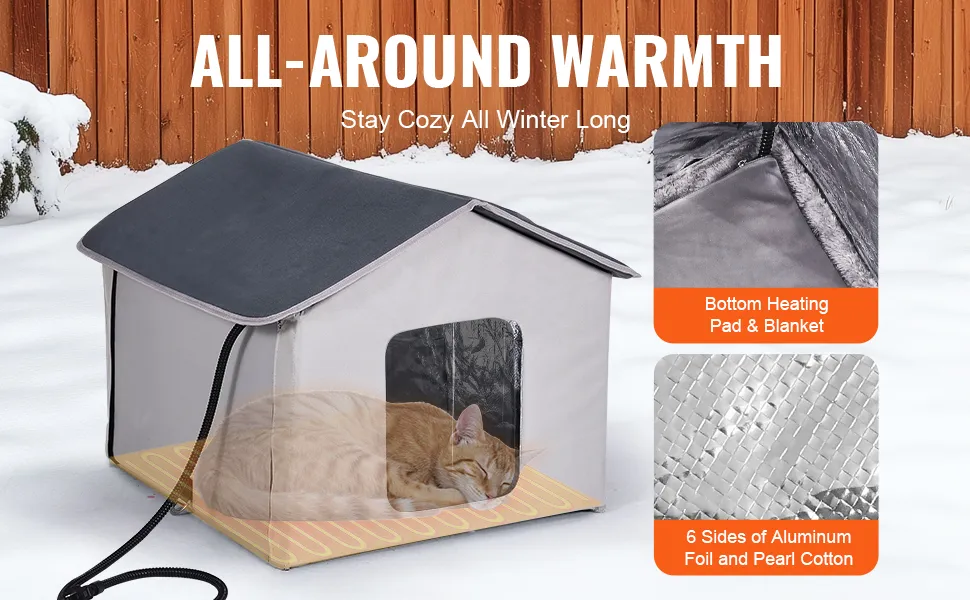 Wbudowana mata grzewcza i miękki kocyk utrzymują idealną temperaturę ciała kota. Sześciostronna folia aluminiowa i izolacja z bawełny perłowej znacznie redukują utratę ciepła, tworząc ciepłą zimową oazę.