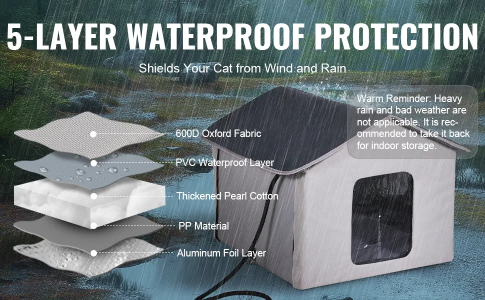 Wysoka wodoodporność: Wykonany z tkaniny Oxford 600D, domek pokryty jest wodoodporną powłoką PVC na wszystkich sześciu ścianach. Wejście wyposażone jest w kurtynę PVC, która minimalizuje wnikanie wilgoci i zimnego powietrza, zapewniając zwierzętom komfortowe, ogrzewane schronienie na zewnątrz w deszczową lub zimową pogodę. Kabel grzewczy jest owinięty materiałem odpornym na gryzienie, co zapobiega jego gryzieniu przez zwierzęta, dzięki czemu domek jest niezawodnym, wodoodpornym i ogrzewanym domkiem dla kotów.