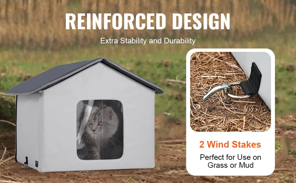 Dla bezpieczeństwa na zewnątrz, ogrzewany domek dla kota jest wyposażony w cztery wiatroodporne kołki, które zapewniają stabilne oparcie na trawie lub błocie. Otoczony rurkami PP, domek oferuje solidne podparcie i zapewnia kotu bezpieczne schronienie.