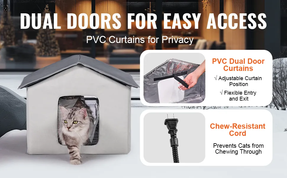 Prywatna i wygodna konstrukcja: Wnętrze zostało zaprojektowane tak, aby pomieścić 1-2 koty. Domek posiada dwa wyjścia i zdejmowany, przezroczysty panel drzwi z wyjściem, dzięki czemu Twój pupil nie poczuje się uwięziony w środku. Przypomnienie: W ekstremalnych warunkach pogodowych, takich jak deszcz lub śnieg, prosimy o natychmiastowe przestawienie ogrzewanego domku, aby uniknąć długotrwałego narażenia na wilgoć. Nie zaleca się wchodzenia do domku kotom o długości powyżej 57 cm.