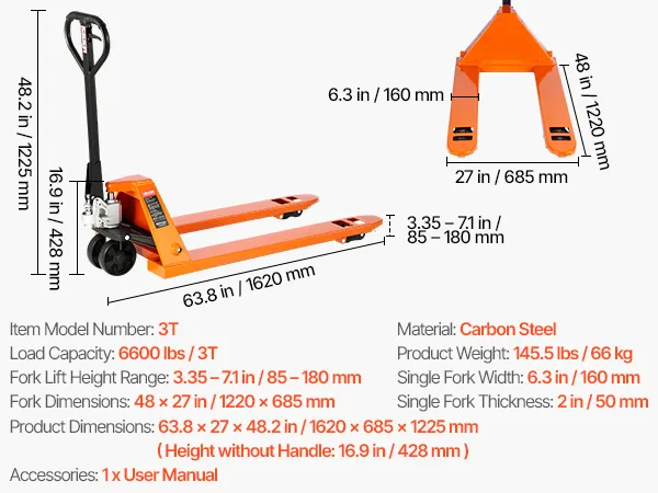 Udźwig 3 ton: Ten wózek paletowy może udźwignąć do 3 ton z widłami o wymiarach 1220 x 685 mm i szerokości 160 mm – idealny do magazynów, fabryk i supermarketów. Dzięki niemu podnoszenie ciężkich ładunków staje się dziecinnie proste.