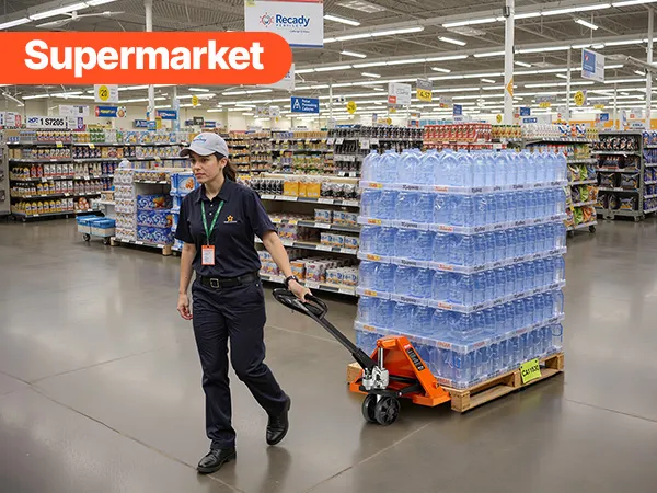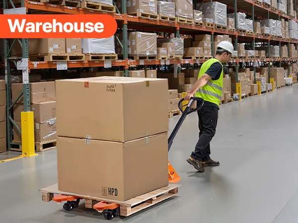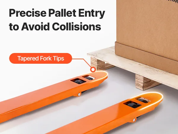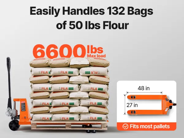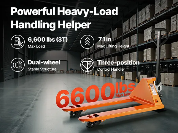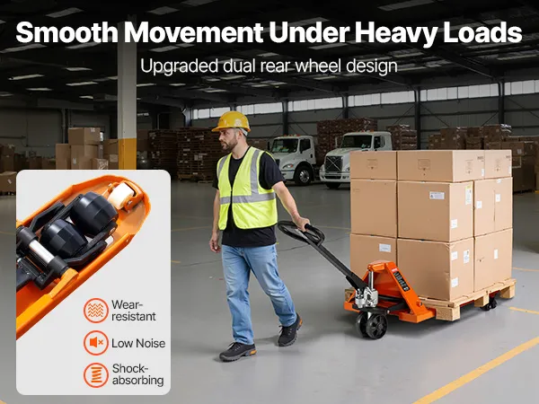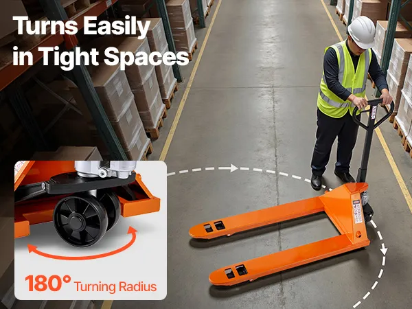 Elastyczny skręt: Ten wózek paletowy jest wyposażony w podwójne koła o średnicy 7 cali (17,78 cm) i oferuje promień skrętu 180°. Dzięki temu idealnie nadaje się do wąskich korytarzy i ciasnych przestrzeni, redukując potrzebę wielokrotnych regulacji podczas jazdy.