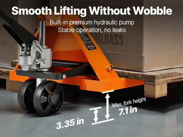 Stabilne podnoszenie: Wyposażony w wydajną pompę hydrauliczną, ten ręczny wózek paletowy bez trudu podnosi ładunki na wysokość do 180 mm, zapewniając stabilność i bezpieczeństwo ładunków, zapobiegając wstrząsom lub nagłym upadkom podczas transportu.