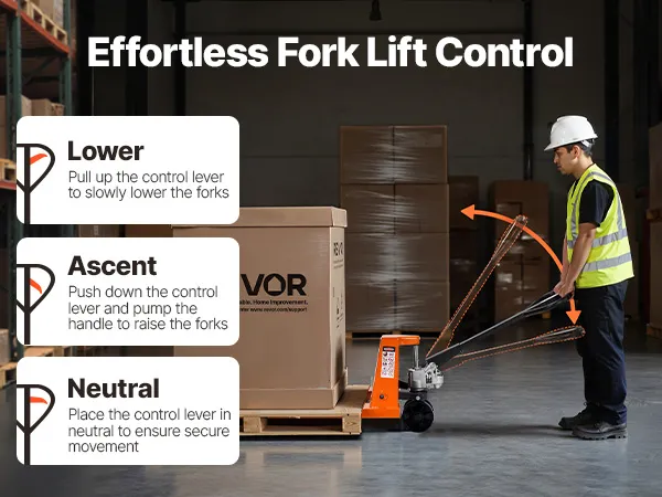 Łatwa obsługa: Łatwe sterowanie wózkiem paletowym za pomocą 3-pozycyjnej dźwigni (podnoszenie, opuszczanie, pozycja neutralna). Opuść, aby podnieść, podnieś, aby opuścić oraz pozycja neutralna zapewniają płynny i bezpieczny ruch. Podwójne tylne koła zapewniają równomierne rozłożenie ciężaru.