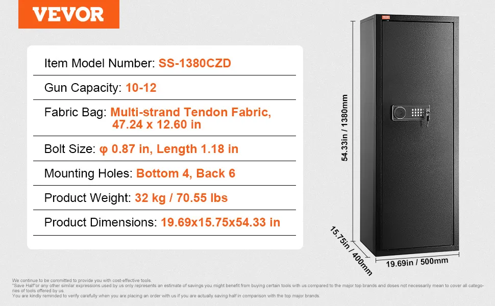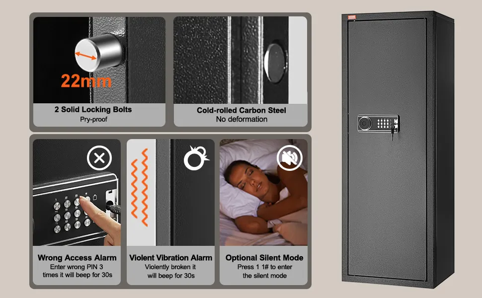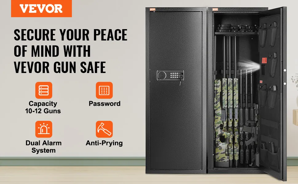 Sejf na broń VEVOR jest wyposażony w inteligentną klawiaturę cyfrową. Możesz ustawić kody od 3 do 8 cyfr, aby uzyskać szybki dostęp. Blokada włącza się automatycznie po zamknięciu drzwi. Dzięki temu Twoja broń pozostaje bezpieczna. Klawiatura jest przyjazna dla użytkownika i łatwa w obsłudze. Zawiera również klucze awaryjne i zewnętrzną skrzynkę na baterie. Te funkcje zapewniają, że nigdy nie zostaniesz zamknięty. 9-cyfrowy kod zabezpieczający dodaje dodatkową warstwę bezpieczeństwa. Ten inteligentny system blokowania jest niezawodny i wydajny. Ten cyfrowy sejf na broń z klawiaturą zapewnia szybki i bezpieczny dostęp do broni.