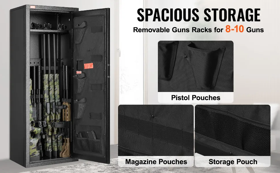 Jeśli chodzi o opcje organizacyjne, sejf na broń VEVOR oferuje wszechstronne opcje przechowywania. Zawiera regulowane półki, które można przesuwać lub usuwać w razie potrzeby. Pozwala to dostosować przestrzeń do przechowywania do swoich potrzeb. Sejf jest również wyposażony w trzy ładownice na pistolety, ładownice na magazynki i torbę użytkową. Te dodatkowe opcje przechowywania pomagają utrzymać broń palną i akcesoria w porządku. Regulowana półka ułatwia dopasowanie różnych rodzajów broni palnej i sprzętu. Uzyskasz maksymalną wydajność, przechowując swoje przedmioty bezpiecznie i schludnie.