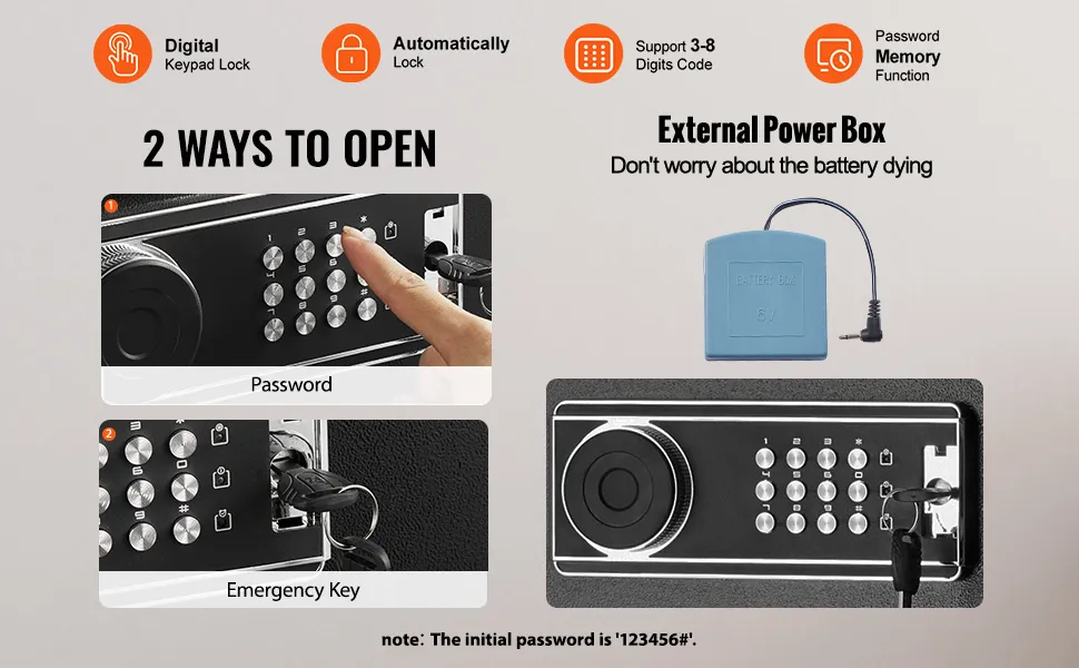 Posiada inteligentny 9-cyfrowy zamek hasłowy. Możesz ustawić kody od 3 do 8 cyfr, a zamek automatycznie włącza się po zamknięciu drzwi. W zestawie znajdują się dwa klucze awaryjne i zewnętrzna skrzynka na baterie. Sejf na broń został zaprojektowany tak, aby chronić Twoją broń palną. Zapobiega to nieautoryzowanemu dostępowi, zwłaszcza przez dzieci. Mocna stalowa konstrukcja sprawia, że jest odporny na podważanie i manipulacje. System alarmowy dodaje kolejną warstwę bezpieczeństwa. Aktywuje się po pięciu błędnych wpisaniach hasła lub gwałtownych uderzeniach. Tryb cichy umożliwia dyskretny dostęp poprzez naciśnięcie kombinacji „11#”. Te funkcje zapewniają, że Twoja broń jest zarówno dostępna, jak i bezpieczna.