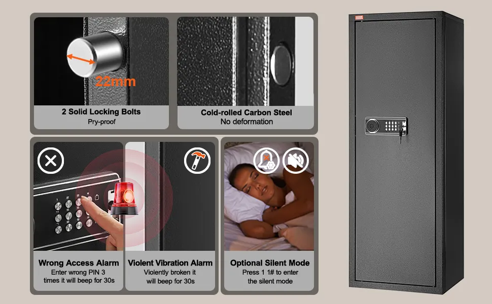 Cyfrowy sejf na broń z klawiaturą zapewnia szybki dostęp do Twojej broni. Skaner linii papilarnych jest szybki i dokładny, więc możesz łatwo dostać się do środka. Ta funkcja jest idealna w sytuacjach awaryjnych. Możesz przechowywać do 10 karabinów i innych akcesoriów. Jest zaprojektowany tak, aby był przyjazny dla użytkownika. Pomaga Ci szybko dostać się do broni, gdy jest to potrzebne. Z tego powodu sejf został wykonany z myślą o wygodzie użytkownika. Ze względu na swoją niezawodność nie będziesz miał czasu na szukanie kluczy. Dlatego ten sejf jest praktycznym rozwiązaniem dla tych, którzy potrzebują szybkiego dostępu. Cyfrowa klawiatura i skaner linii papilarnych sprawiają, że jest to wydajny wybór.