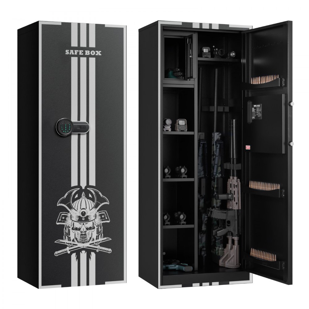 Szafa na broń VEVOR na 4 sztuki broni długiej, sejf na broń z 3 magazynkami, 2 regulowanymi uchwytami, oświetleniem LED, szafa na broń z klawiaturą cyfrową i kluczem awaryjnym, sejf na broń do pistoletów i karabinów
